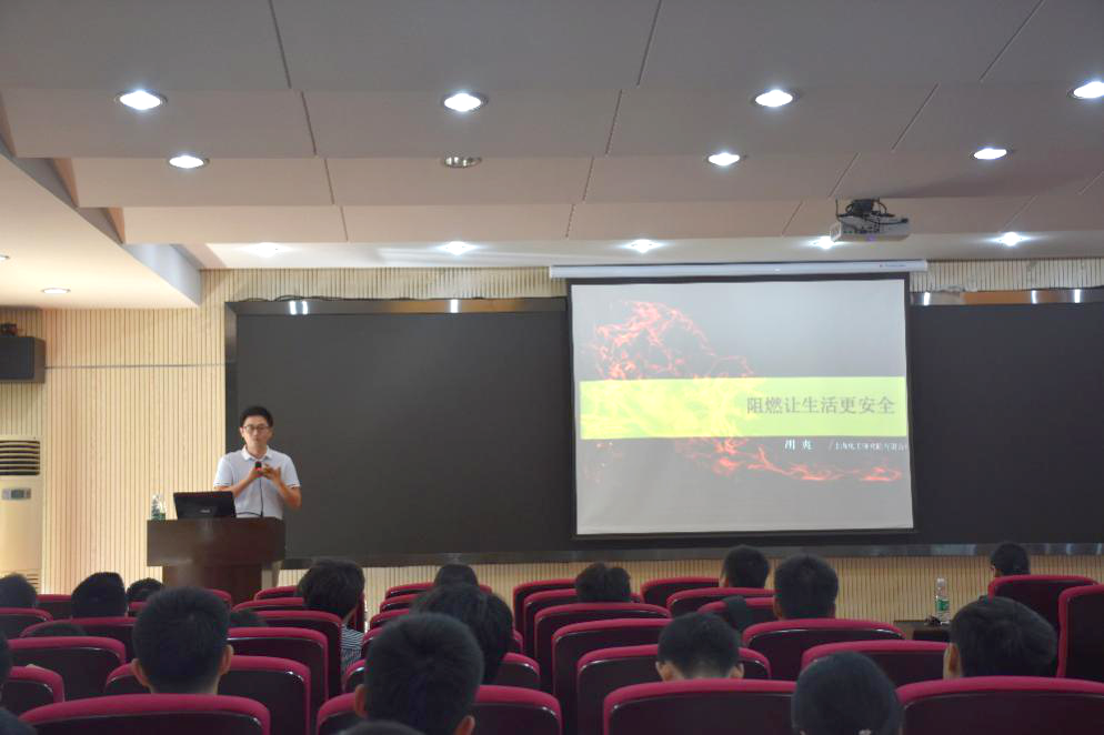 胡爽博士以《阻燃让生活更安全》为题,向在场师生介绍了火灾的发生对人们生命、财产安全带来的巨大危害,而阻燃技术是从材料出发,从源头上遏制火灾发生的有效方法。在报告中,胡爽博士为我们介绍了阻燃技术的发展历程,阻燃原理,阻燃剂的应用分类、阻燃产品的开发等内容,并与在场师生进行了深入交流。