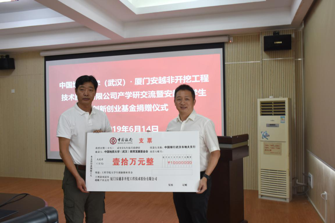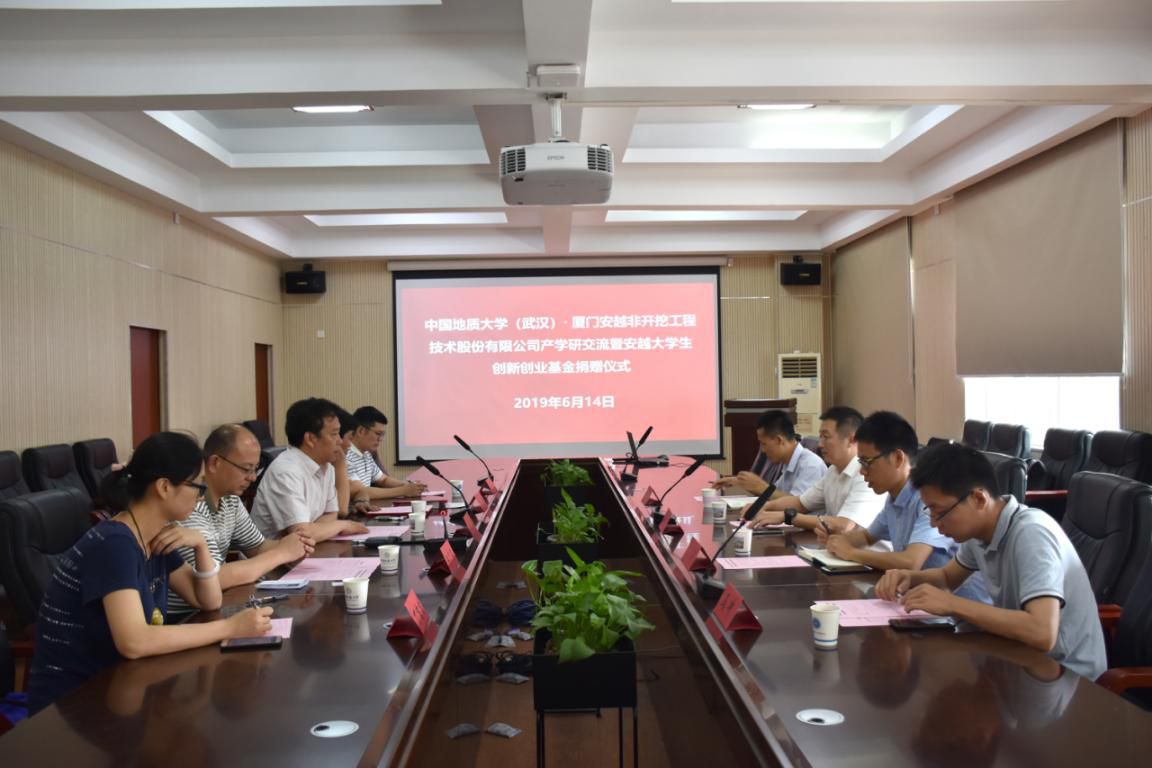 2019年6月14日上午,厦门安越非开挖技术股份有限公司来校作产学研交流,并捐赠10万设立安越大学生创新创业基金,捐赠仪式在315举行。厦门安越非开挖技术股份有限公司董事长廖宝勇一行、武汉中地大非开挖研究院有限公司总经理孔耀祖,校友工作与教育基金管理处副处长吕占峰、丁苗苗,安博官方网站党委书记陈飞、党委副书记江广长、副教授曾聪参加会议。江广长主持会议。
