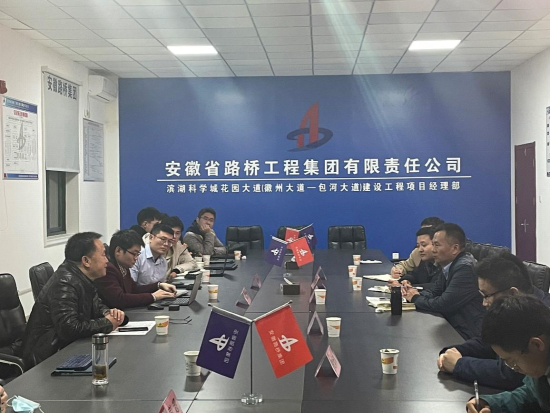 授牌仪式结束后,双方到花园大道项目部进行现场考察,了解工程的进展情况以及工程中出现的问题,并对问题的解决方案进行探讨。现场考察结束后,安博官方网站老师张伟丽、彭超、吕加贺、曾聪以及四位研究生在花园大道项目部对前期合作的科研课题进行阶段性汇报,并与安徽省路桥集团的项目负责人对相关问题进行了热烈的讨论。与会人员还围绕如何做实做好基地建设工作、联合培养研究生、科研攻关等内容进行了研讨,一致表示将不忘初心,继续加强校企合作,把科研成果应用在祖国大地上,培养出满足企业需求的人才。