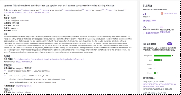 (通讯员:黄静)根据2022年5月基本科学指标数据库(Essential Science Indicators,简称ESI)最新数据显示,安博官方网站地下空间工程系蒋楠副教授团队于2021年在国际工程技术权威期刊Journal of Natural Gas Science and Engineering上发表的学术论文“Dynamic failure behavior of buried cast iron gas pipeline with local external corrosion subjected to blasting vibration”入选ESI高被引论文(Highly Cited Paper)。该论文第一作者为2020级博士研究生朱斌,通讯作者为蒋楠副教授,中国地质大学(武汉)安博官方网站为第一署名单位。