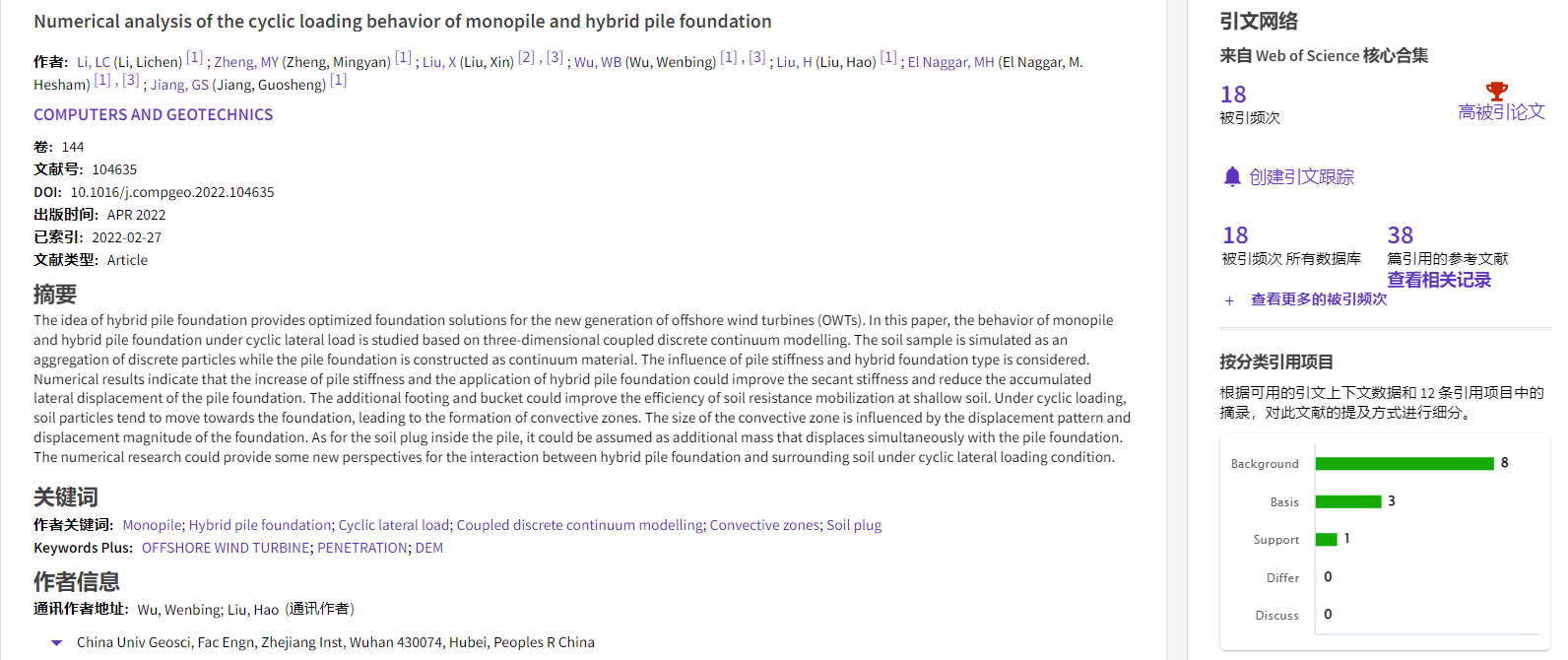 根据2022年11月基本科学指标数据库(Essential Science Indicators,简称ESI)最新数据显示,安博官方网站勘察与基础工程系吴文兵教授团队于2022年在国际岩土工程数值模拟权威期刊Computers and Geotechnics上发表的学术论文“Numerical analysis of the cyclic loading behavior of monopile and hybrid pile foundation”入选ESI高被引论文。该论文第一作者为勘察与基础工程系博士后李立辰,通讯作者为吴文兵教授,中国地质大学(武汉)安博官方网站为第一署名单位。
