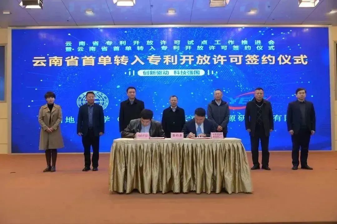 (通讯员 蔡记华 杨现禹 黄静)2月28日下午,在云南省市场监督管理局(知识产权局)、昆明市市场监督管理局(知识产权局)的指导下,昆明高新技术产业开发区管理委员会在昆明高新区西区火炬大厦隆重举办了“云南省开放许可试点工作推进会暨云南省首单转入专利开放许可签约仪式”活动。会上,云南省能源研究院有限公司与中国地质大学(武汉)就基于我院蔡记华教授、杨现禹副教授团队成果“纳米颗粒流体的页岩纳米孔隙封堵实验装置及方法”“基于多参数的离散元纳米颗粒封堵页岩孔隙数值模拟方法”“一种稳定页岩的水基钻井液”3项发明专利签署了专利开放许可协议,这是云南省签约的首单转入专利开放许可。