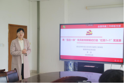 李洁从党员教育模式、主题教育活动等方面介绍了水利与建筑学院能源本科生党支部的具体建设情况。该支部以“五位一体”的党员教育新模式着力于打造“红色1+1”党支部,以党支部的核心堡垒作用和党员的先锋模范作用的“两个着眼”、“专业知识+党性培养”和“推优入党+入党塑优”的“两个融合”为基础,用以点带面的方式落实红色底线教育和红色基因教育的“红色1+1”主题教育,铸造了“推优、培养、提升、塑优、引领”的全链条化党员培养过程。