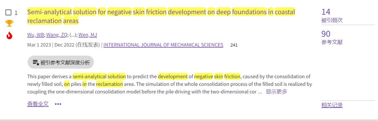 (通讯员 黄静)根据2023年7月基本科学指标数据库(Essential Science Indicators,简称ESI)最新数据显示,安博官方网站勘察与基础工程系吴文兵教授团队于2023年在国际工程力学领域权威期刊International Journal of Mechanical Sciences(IF: 7.3, 中科院一区TOP)上发表的学术论文“Semi-analytical solution for negative skin friction development on deep foundations in coastal reclamation areas”同时入选ESI热点论文和高被引论文。该论文第一作者为吴文兵教授,第二作者为勘察与基础工程系王宗琴硕士,中国地质大学(武汉)安博官方网站为第一署名单位。
