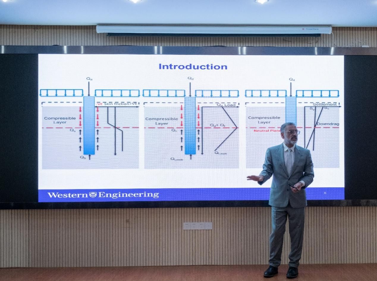 M. Hesham El Naggar教授作了题为“Induced Drag Forces on Pile Foundations of Integral Abutment Bridges”的学术报告。该报告详细介绍了软土地基上桥台桩基桩周土体负摩阻力的形成机理及发展过程,并以一个长达四年的现场试验项目为例,阐述了软土地基上桥台桩基进行负摩阻力评估的理论原理和试验方法,并详细介绍了桩基负摩阻力有限元模拟的建模方法、本构模型和接触理论,为桩基负摩阻力问题提供了可靠的分析手段和设计方法。