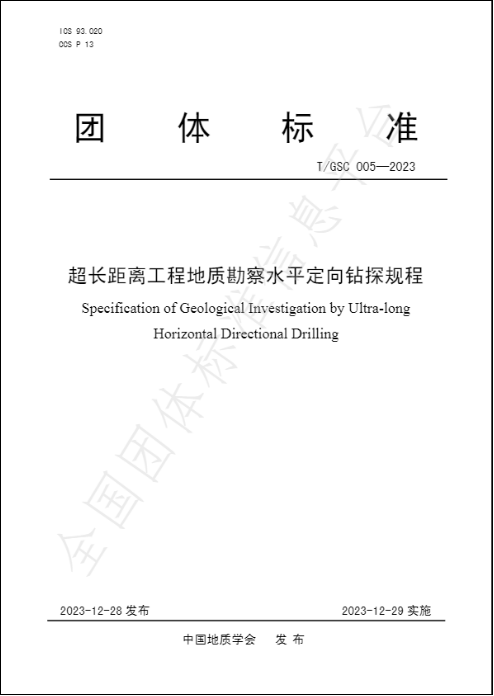(通讯员 闫雪峰)近日,由我院窦斌教授主持制定的《超长距离工程地质勘察水平定向钻探规程》(T/GSC 005-2023)被中国地质学会团体标准委员会审定通过,并于2023年12月29日起正式实施。