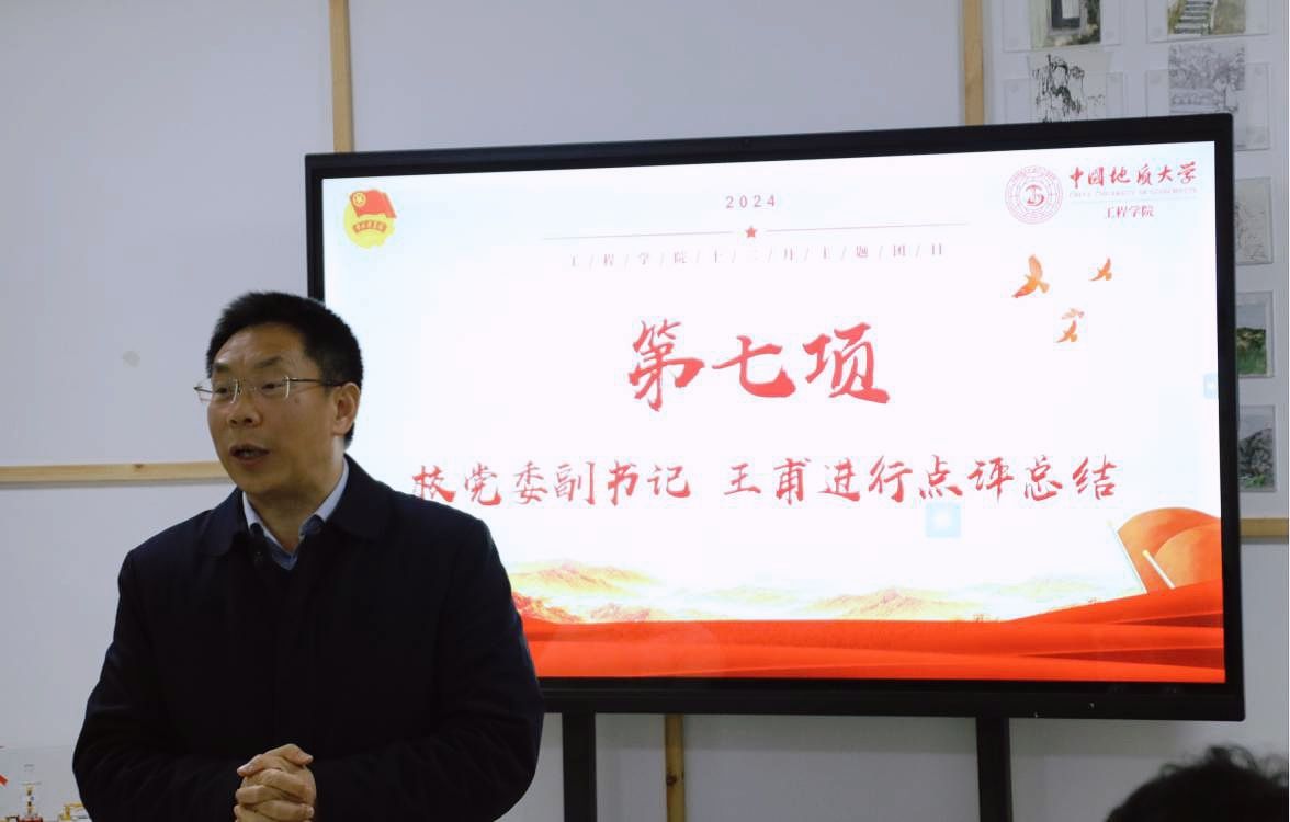 主题团日第二项,宁伏龙教授分享他带领团队参与“梦想”号智能船载岩心转运系统设计、制造、安装和海试的工作经历。回首与团队成员在“梦想”号上不懈打拼的1200多个日夜,他讲到,“梦想”号的成功建成入列,根本在于党中央的坚强领导和新型举国体制的巨大优势。在学校重点支持和校内5个成员单位、10余名专家学生以及10余个工业界合作伙伴的共同努力下,团队终于攻克了首套智能船载岩心转运系统的4大设计难题,研发了5大类、45项关键技术和9套核心装备,建成了全球第一套智能船载岩心转运系统。他勉励同学们,要在学习和科研工作中探索将科学思维和工程思维有力结合,牢固树立“时间+成本”的企业管理理念,要与企业开展紧密合作,要发扬斗争精神掌握斗争本领,在攻坚克难中实现人生目标。他由衷地说,三年来团队成员积极发扬“艰苦朴素、求真务实”的校训精神,积极践行钻探人“攻坚克难、勇攀高峰”的价值追求,成功把中国地质大学(武汉)的校徽印在了中国首艘大洋钻探船“梦想”号之上,学校校徽要跟随“梦想”号服役25年以上,这是地大科研团队的光荣,今后团队将继续奋发努力、积极作为,为我国的深海进入、深海探测、深海开发事业做出新的贡献。